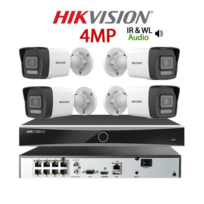KIT 4 Camere video cu upgrade la 8, IP PoE, 4MP Dual Light IR & WL 30M, 2.8mm, Microfon, NVR PoE, HIKVISION – KIT4UP8CHAHIP-4A24IRWL